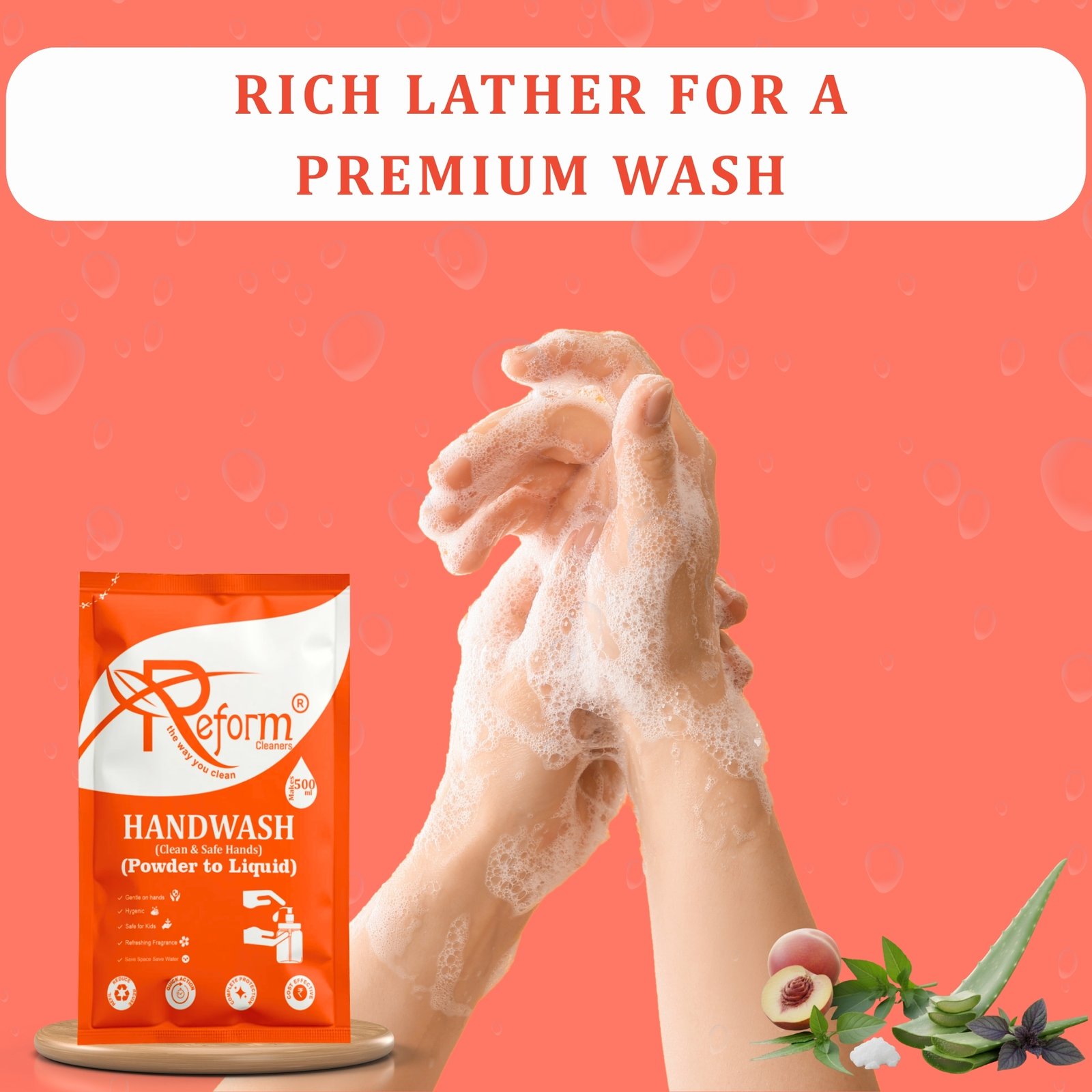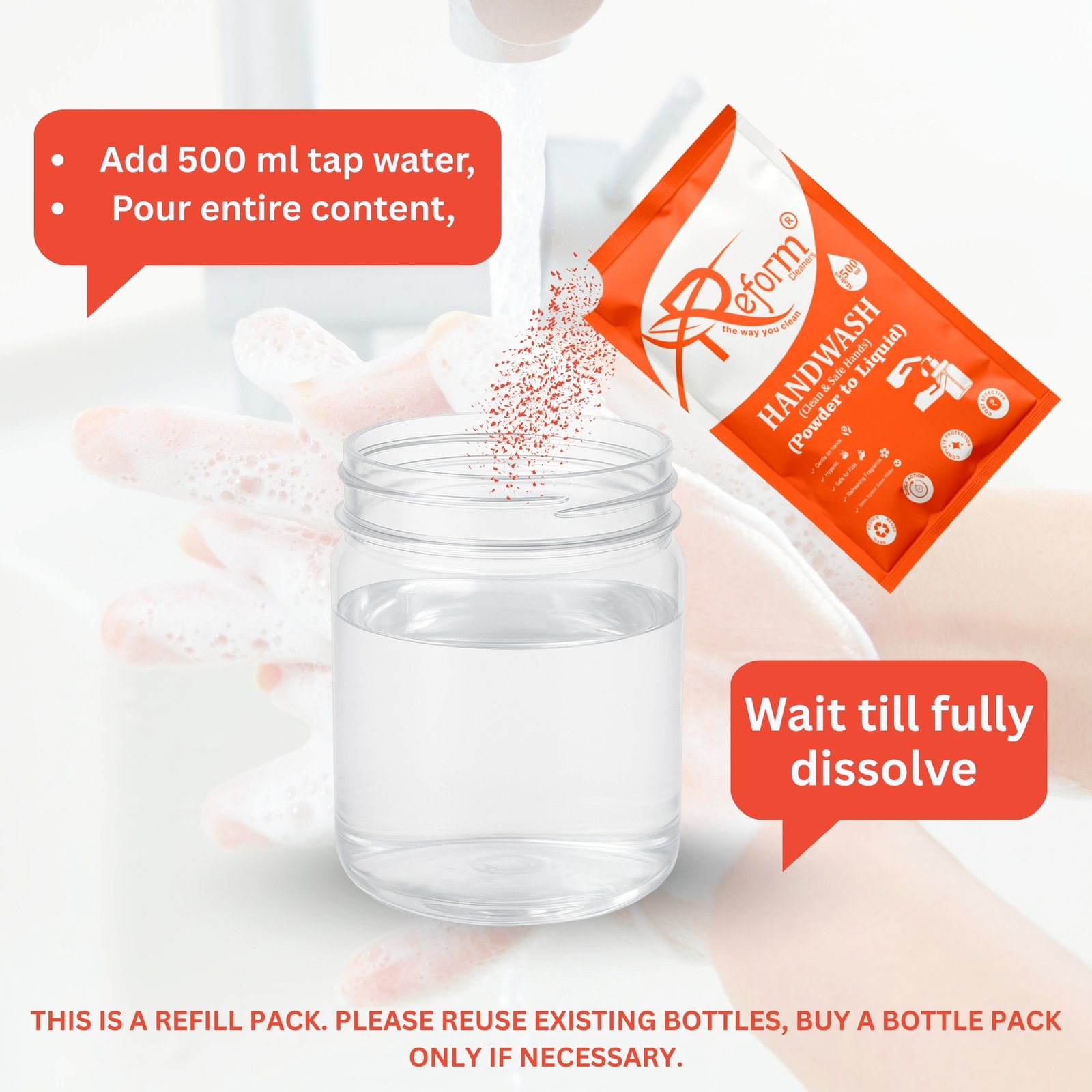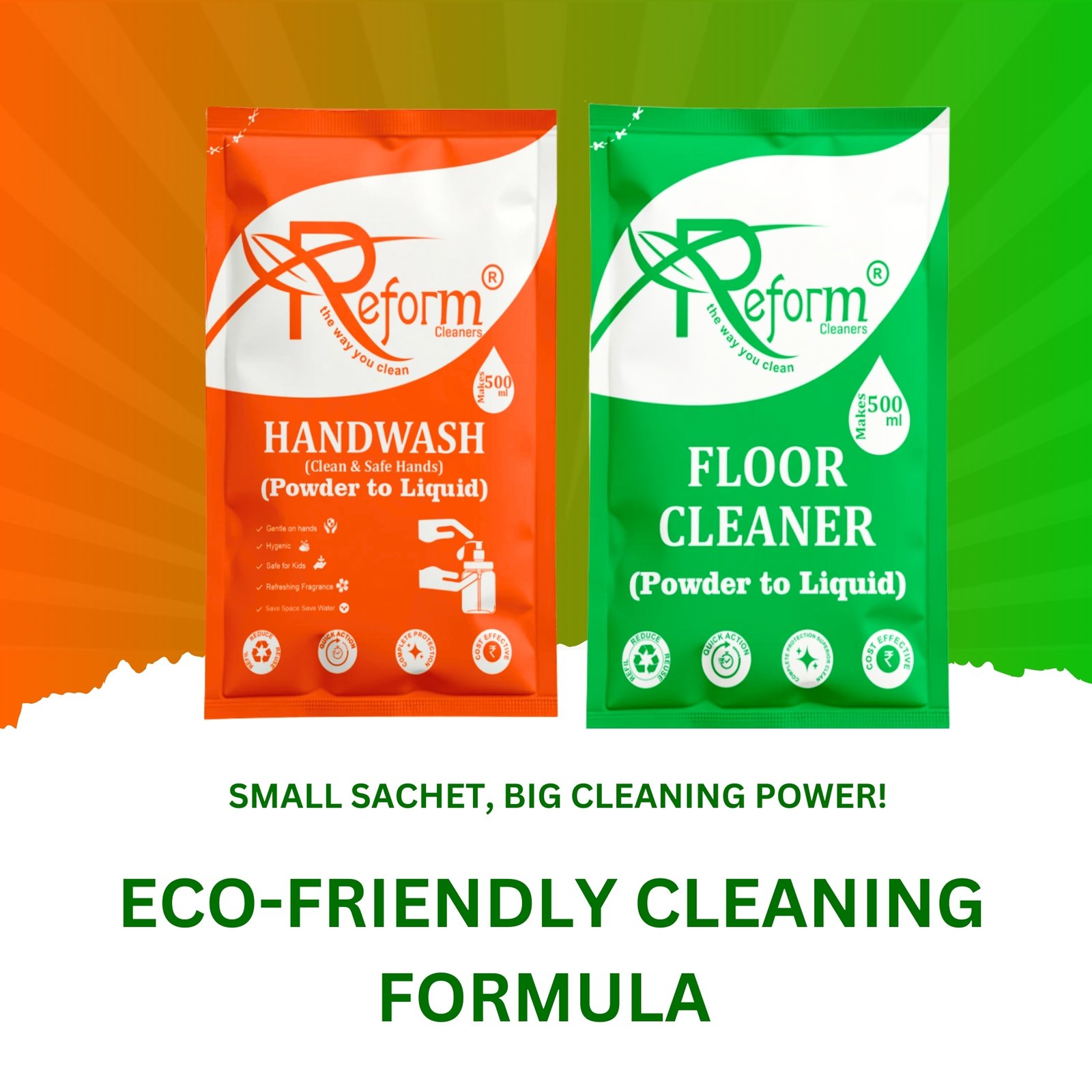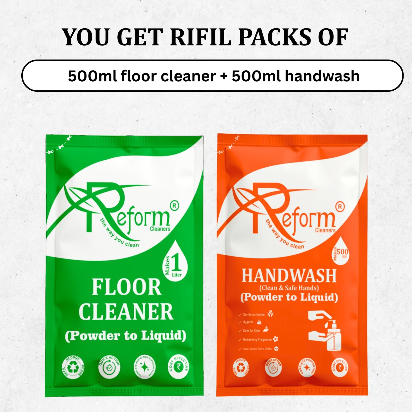 Upgrade everyday hygiene with the Reform Cleaners Smart Home Hygiene Combo, featuring Floor Cleaner (500ml) and Handwash (500ml) made using advanced Powder-to-Liquid Technology. Each compact pouch converts into a high-performance liquid cleaner by simply adding water—helping you avoid paying for water, save storage space, and reduce single-use plastic bottles.
