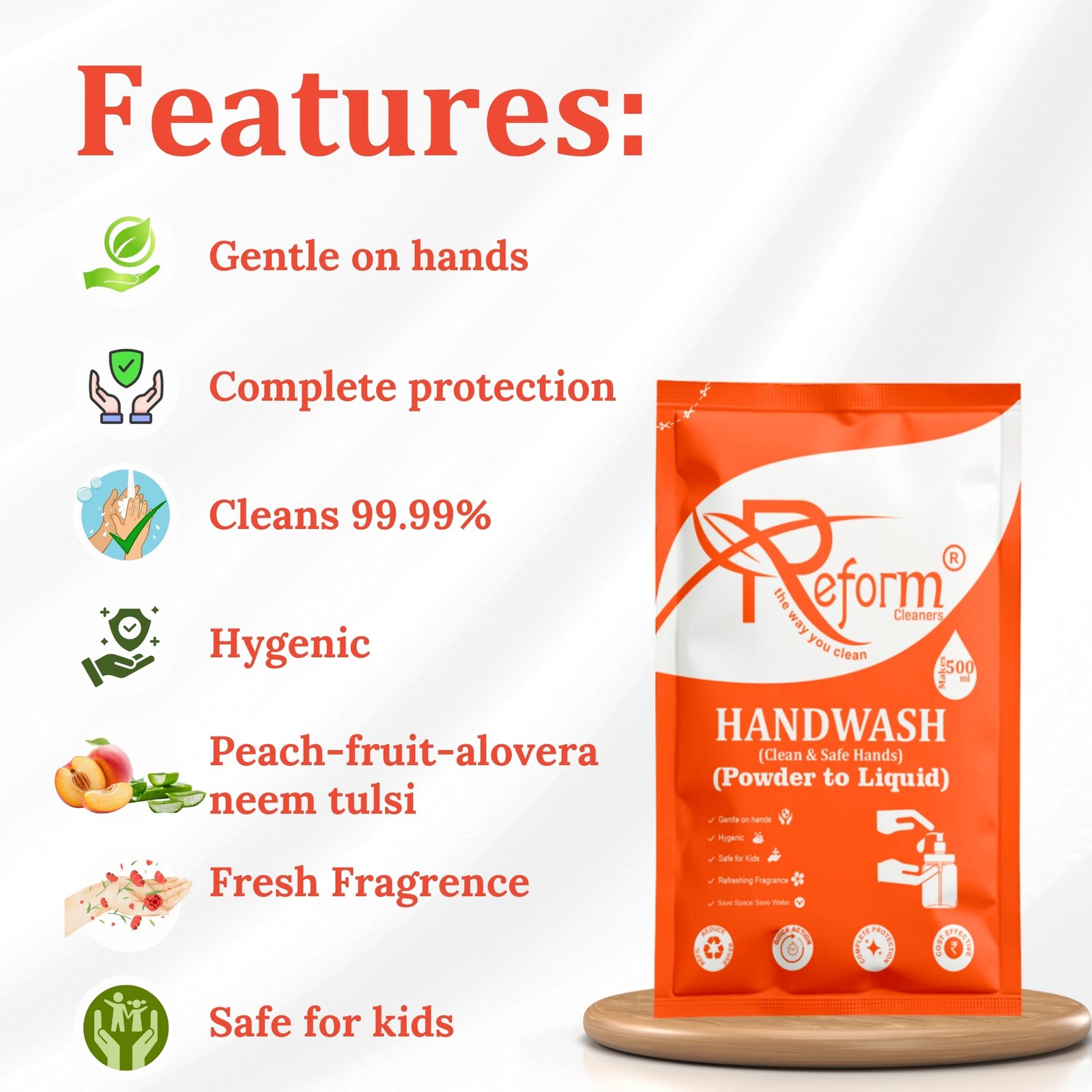 - The Floor Cleaner removes dust, dirt, stains, and germs while being gentle on surfaces like marble, tiles, granite, wood, and cement. Its antibacterial, quick-dry, streak-free formula leaves floors clean, shiny, and fresh without harsh fumes, making it ideal for daily use in homes and high-traffic areas.2. The Handwash delivers a rich, foaming cleanse using plant-based, skin-friendly ingredients. It effectively cleans hands without dryness, making it safe for kids, sensitive skin, and frequent washing. Free from harsh chemicals, it keeps hands soft, fresh, and protected throughout the day.