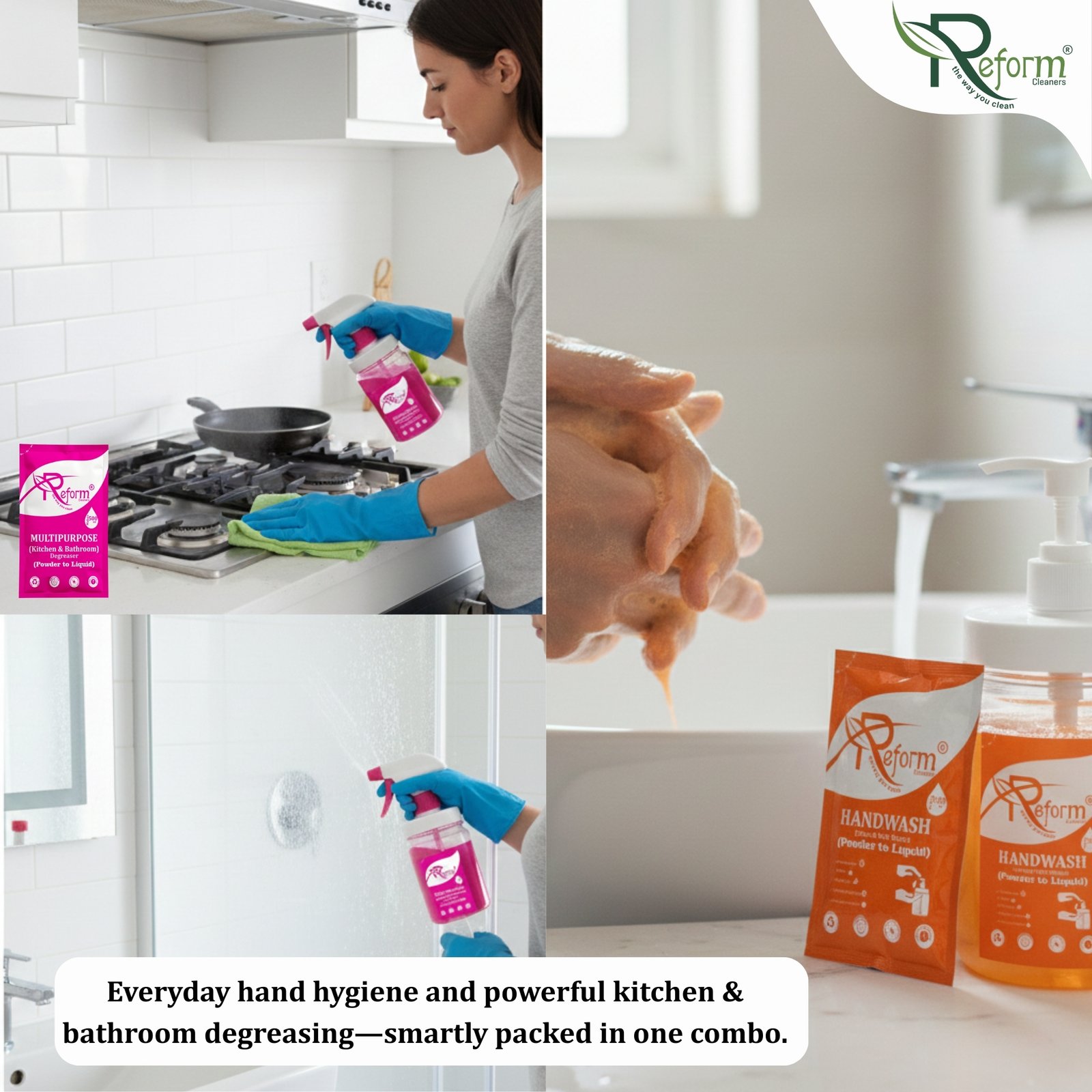 Upgrade your everyday hygiene with the Reform Cleaners Smart Hygiene Combo, featuring Multipurpose Cleaner (500ml) and Handwash (500ml) in compact powder-to-liquid refill pouches. Each pouch converts into a high-performance liquid cleaner when mixed with water, helping you avoid bulky bottles, reduce plastic waste, and stop paying for water.