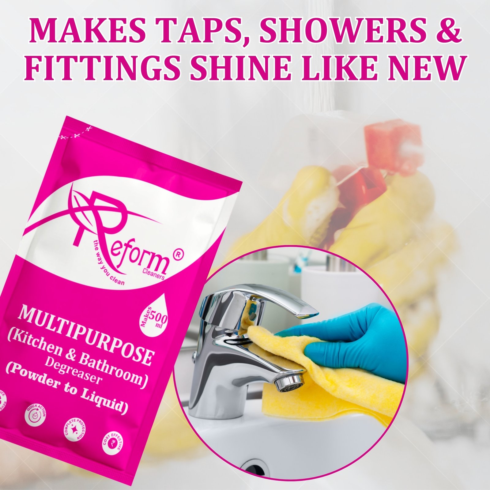 Restores shine on taps, showers, sinks, and steel fittings.