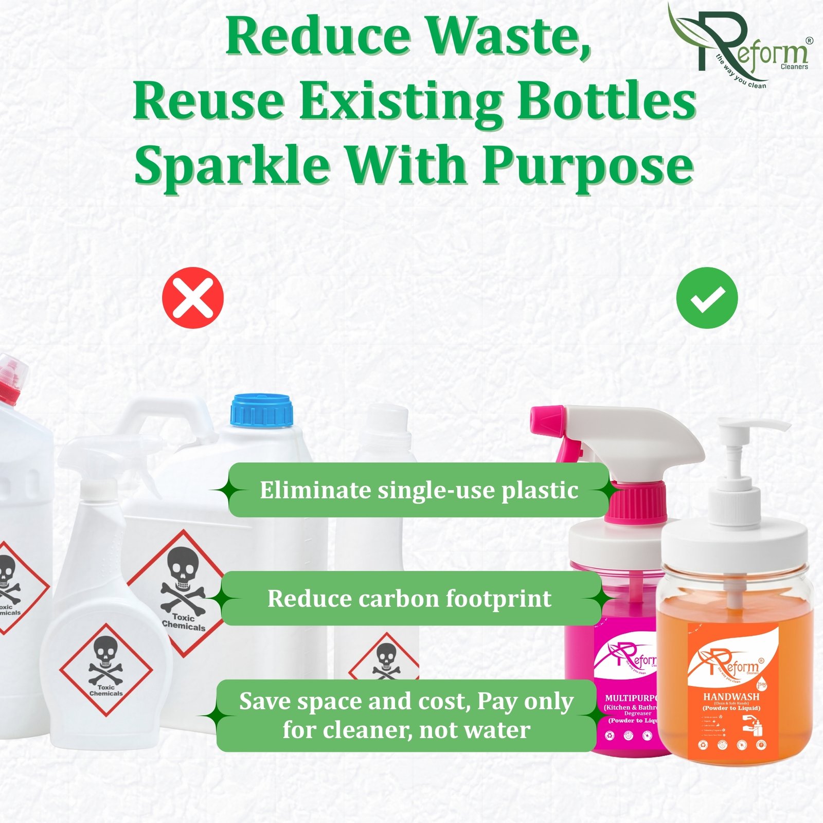 Why Choose Reform Floor Cleaner (Powder to Liquid): Reform Cleaners brings an eco-smart floor cleaning revolution with its Powder-to-Liquid Technology. Experience deep cleaning, antibacterial protection, and freshness — all from a compact, space-saving pouch. Perfect for daily home use or large-scale commercial cleaning, Reform ensures spotless results while saving water, space, and the environment. Clean Smart. Clean Safe. Clean with Reform! 🌿✨