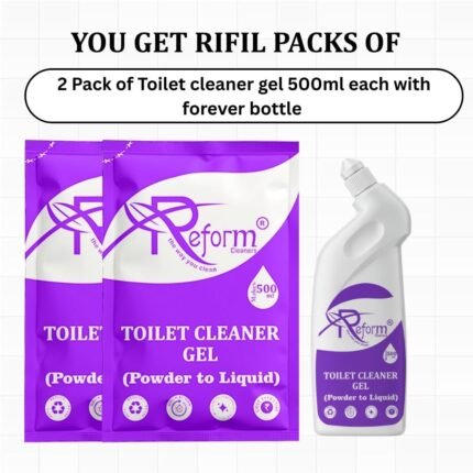 Reform introduces the innovative Toilet Cleaner Gel (Powder to Liquid) Pack of 2 With Forever Bottle — a powerful, space-saving, and sustainable cleaning solution designed for homes and professional use. Each compact pouch turns into 500ml of strong gel cleaner when mixed with water, giving superior stain removal, fresh fragrance, and long-lasting hygiene. Perfect for households, hotels, restaurants, offices, cleaning service providers, and institutions, this eco-friendly formula is vegan, non-toxic, safe on hands, fittings, and septic systems.