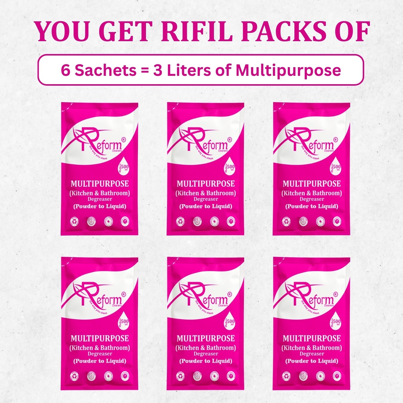 Reform Cleaners – Multipurpose Kitchen & Bathroom Degreaser (Powder to Liquid) | Pack of 6 Refill Pouches (Makes 3 Liters) | Space-Saving, Non-Toxic, Cost-Effective Cleaning Solution