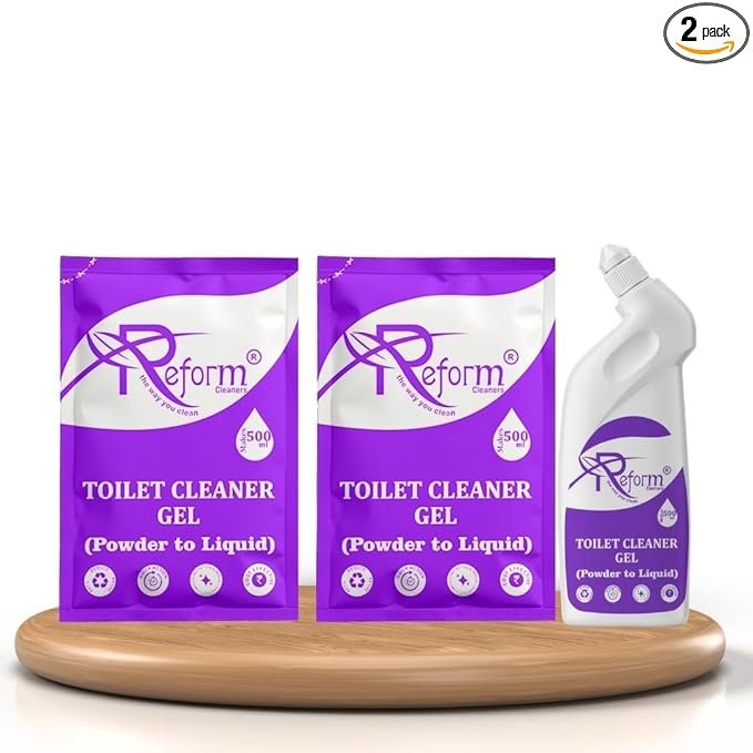 Reform introduces the innovative Toilet Cleaner Gel (Powder to Liquid) Pack of 2 With Forever Bottle — a powerful, space-saving, and sustainable cleaning solution designed for homes and professional use. Each compact pouch turns into 500ml of strong gel cleaner when mixed with water, giving superior stain removal, fresh fragrance, and long-lasting hygiene. Perfect for households, hotels, restaurants, offices, cleaning service providers, and institutions, this eco-friendly formula is vegan, non-toxic, safe on hands, fittings, and septic systems.